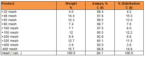 • All size fractions larger than 150 mesh yielded grades of at least 95.5% C(t)